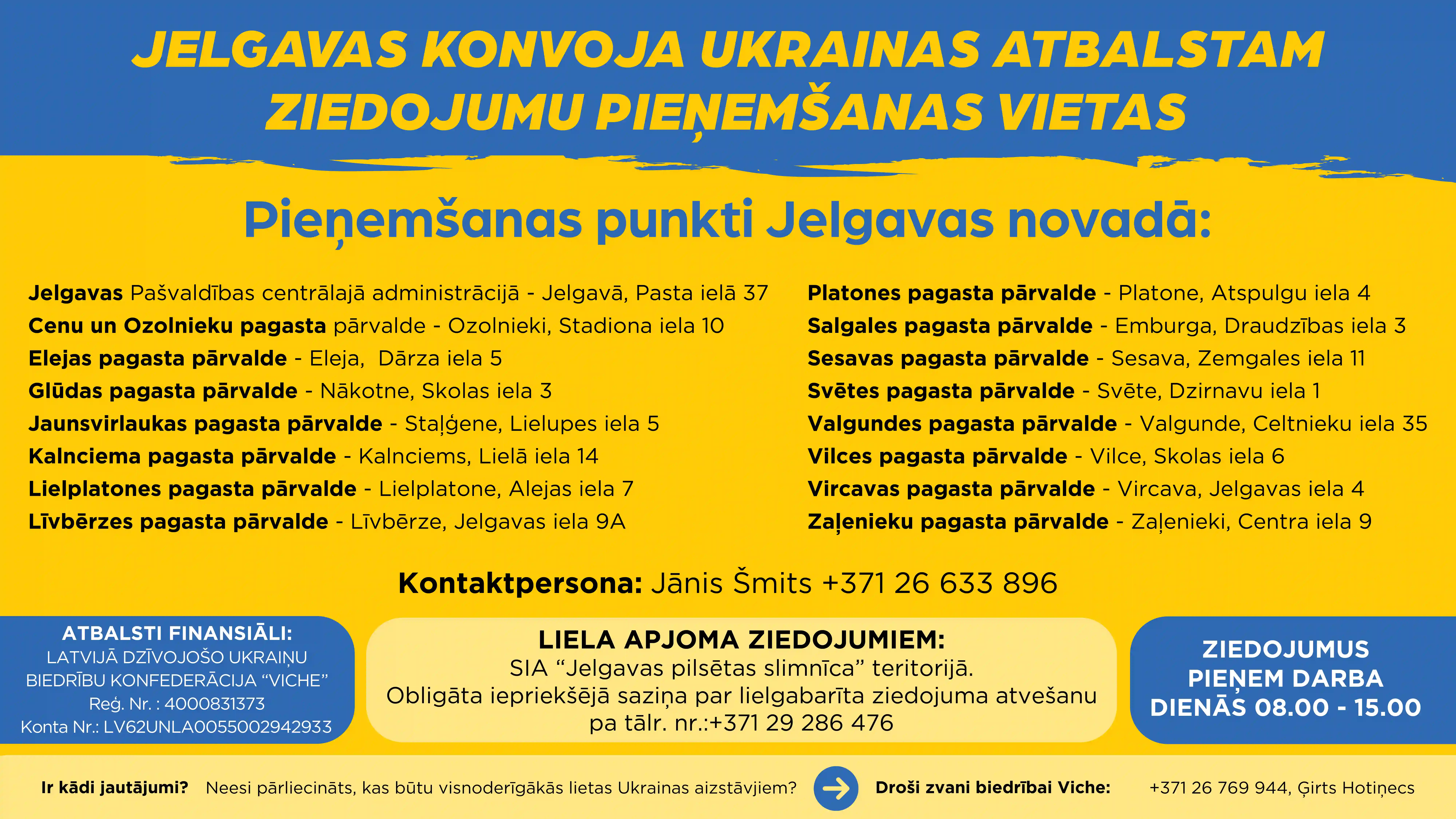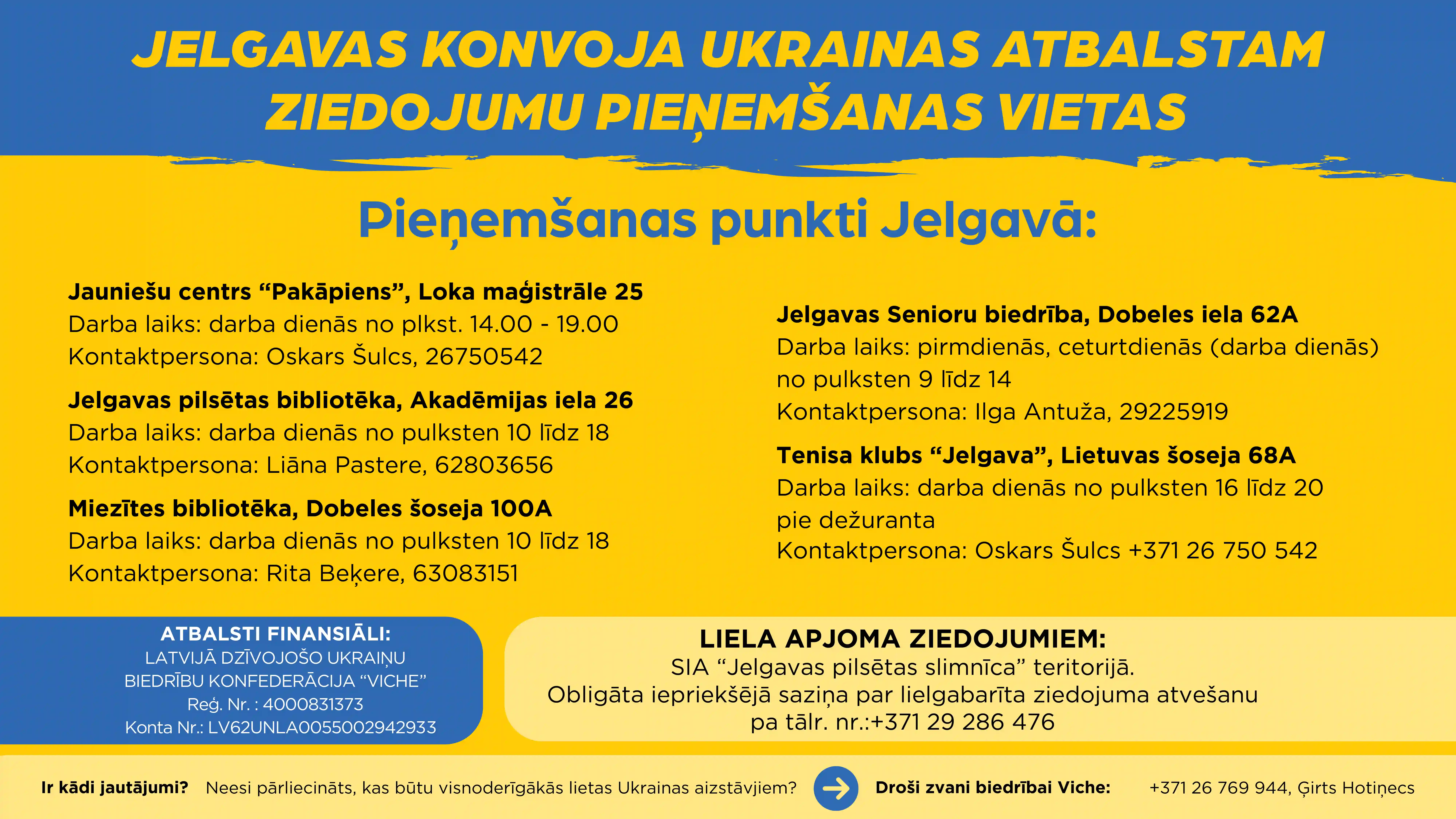 Turpinoties pilna mēroga karam Ukrainā, Latvijā dzīvojošo ukraiņu biedrību konfederācija "Viche" sadarbībā ar LATRAPS, Jelgavas novada pašvaldību un Jelgavas valstspilsētas pašvaldību aicina iedzīvotājus un uzņēmējus sniegt palīdzīgu roku, ziedojot Ukrainas atbalstam nepieciešamo līdz 2025. gada 5. janvārim.