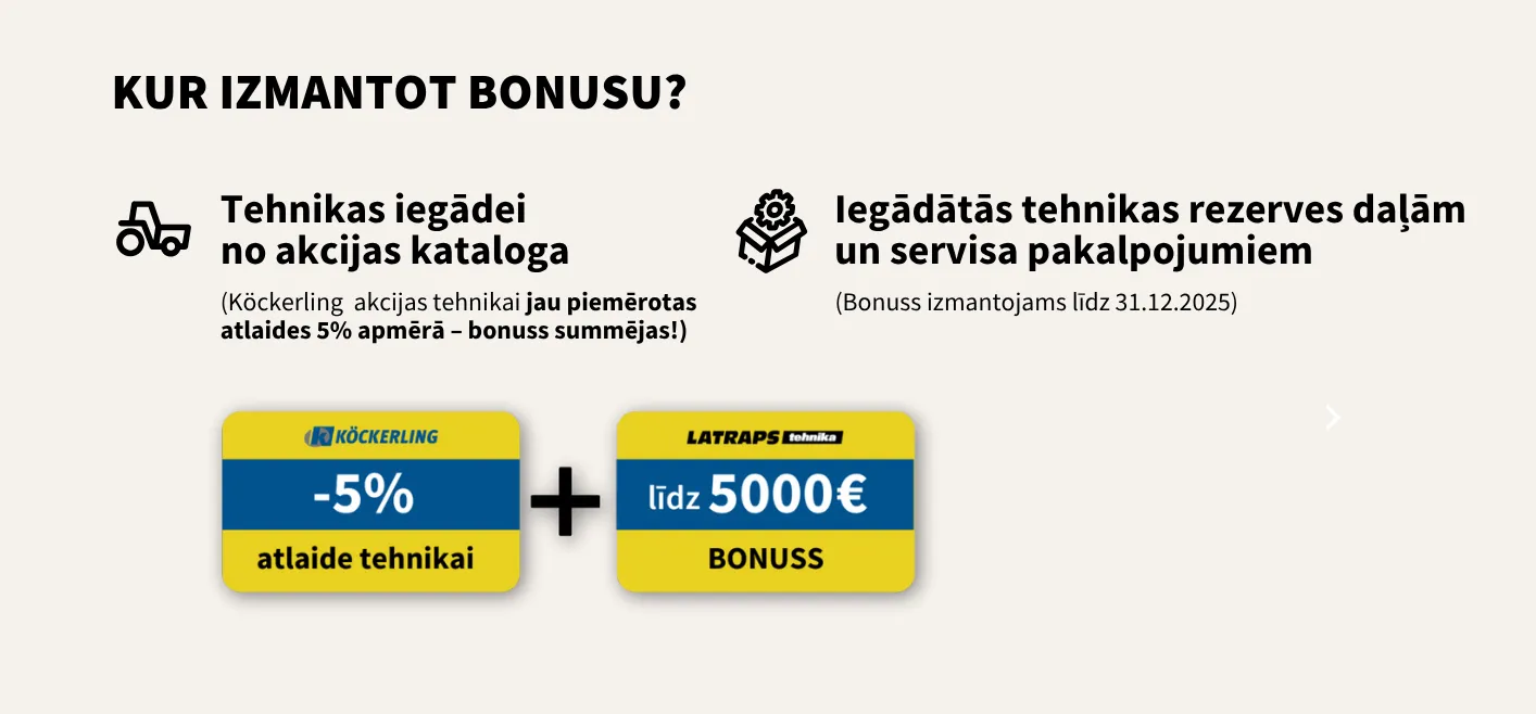 Divkāršs ieguvums! Visai Köckerling akcijas tehnikai jau piemērota 5% atlaide, un papildus iespējams saņemt līdz pat 5000 € bonusu par produkcijas piegādēm, ko var izmantot Köckerling akcijas tehnikas iegādei, tās servisam vai rezerves daļām no LATRAPS Tehnika!